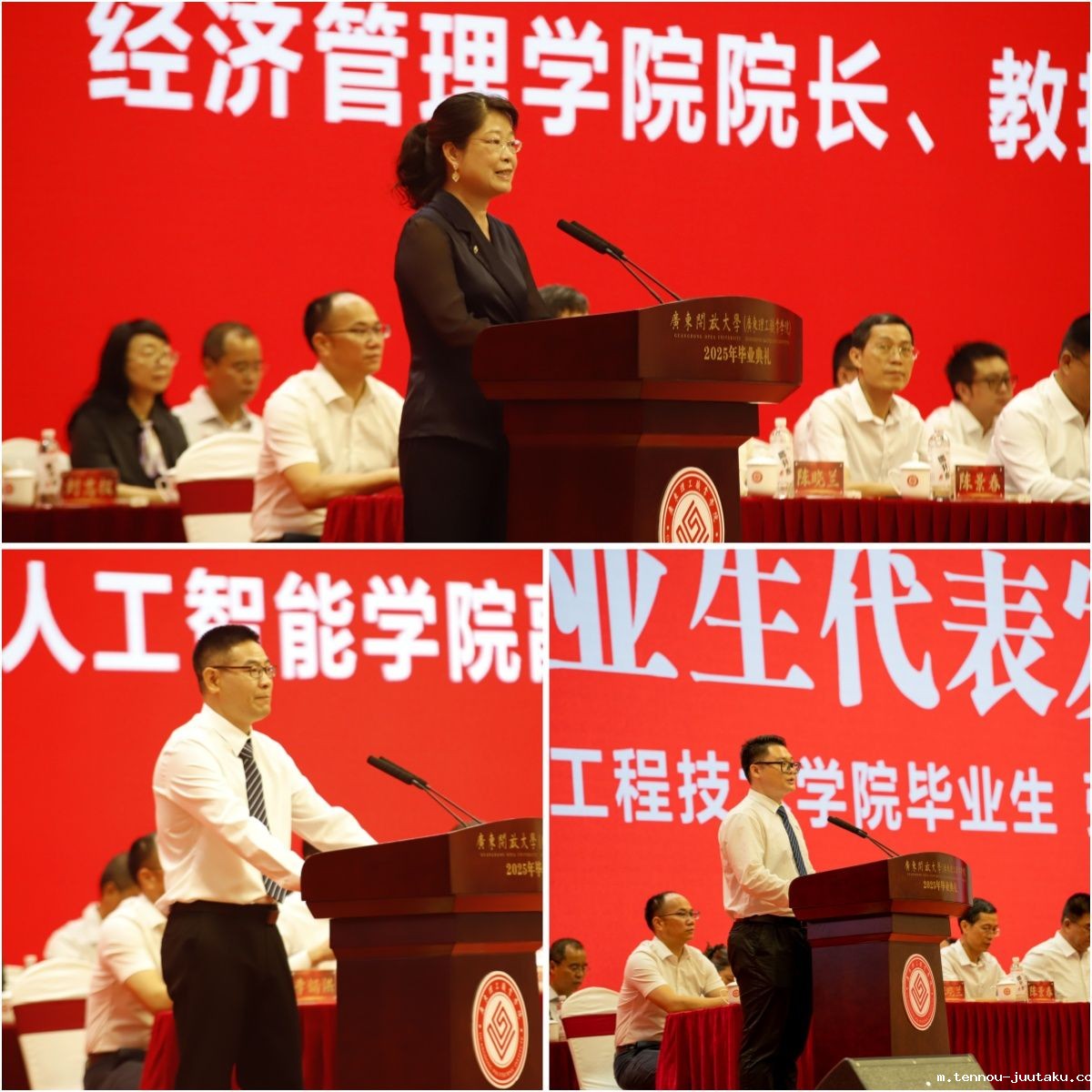 谢锦群宣读了《关于表彰2025届毕业生综合测评先进集体和先进个人的决定》,丁晋清向毕业生先进班集体代表颁奖,宋波向优秀毕业生代表颁奖,全体校领导为现场千名毕业生代表逐一颁发毕业证书。毕业生代表、工程技术学院学生张浩,教学机构负责同志代表、经济管理学院院长、教授赖文燕和教师代表、人工智能学院副教授刘小飞先后发言,毕业生代表向教职员工代表献花,分别表达了对母校和师长的感恩之情及对毕业生们的温馨祝福。